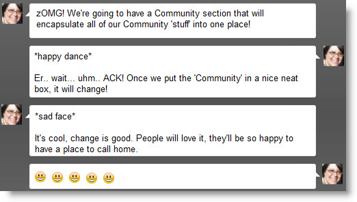 Remember earlier when I talked about freaking out... yea you should have all seen me when we first started talking about having a Community section in the top nav. It was truly a combination of elation and mind-numbing fear. Picture this conversation that went on my head if you will: