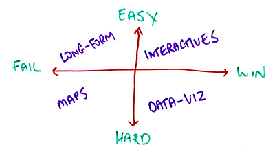Now, what you may find when you do this is certain content formats fit within this grid. So, for example, you may find that doing data viz is actually really, really hard, but it gets you lots and lots of links, whereas you might find that producing maps and visuals around that kind of data is actually really hard but isn't very successful.