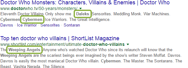 We've moved from simply synonyms to a world of answers. Here's another example, a search for "Doctor Who villains":