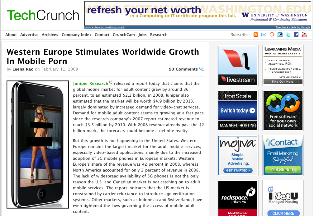 TechCrunch also optimizes porn posts for users, not just search engines. Often they do this by including mildly risque above the fold images in blog posts. In addition to having a positive impact on decreasing bounce rates for first time visitors who arrive from porn queries, these thumbnails likely have high click through rates when articles are picked up on Techmeme and other news aggregators. And like other TechCrunch blog post images, these risque images are not hyperlinked, which encourages more clicks on the c column advertisements.