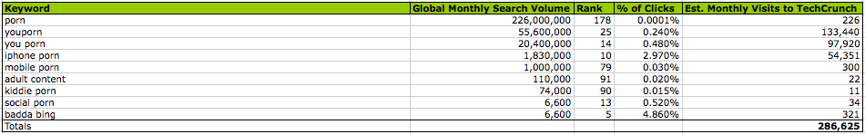 What does this mean for TechCrunch's traffic? Well, based on monthly search volume, if you assume industry average SERP click through rates, it's not unreasonable to estimate that TechCrunch generates over a quarter million visits a month from x rated queries.