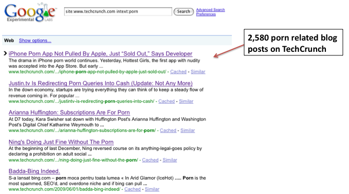 In the last year alone, TechCrunch made over 550 blog posts with the word porn in body of the post. In some cases the articles addressed popular, newsworthy stories such as the much talked about iPhone porn app, but in a number of cases the stories were a bit more of a stretch. Newsworthy or not, TechCrunch blogs about porn when they have the opportunity. And though the porn related articles they write typically don't top the SERPs, they do rank on the first 1-3 pages for a number of high volume porn related queries, including terms such as 'youporn,' 'you porn,' and 'iphone porn.'