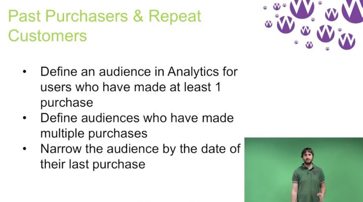 Another smart way to capture an audience is to look at past purchasers and repeat customers. You can define these audiences based on users who have made exactly one purchase as a "past customer," and users who have made more than 1 purchase as "repeat customers." There are lots of studies that indicate customers will convert at a higher rate and spend more, so it makes sense to target customers differently than non-customers.