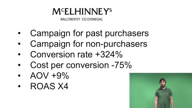 Based on these studies, as well as our own insights from Google Analytics, we implemented a strategy for another one of our clients, McElhinneys, to break our audience down into 2 distinct categories: one for past customers, and one for users who were yet to purchase from us. This allowed us to target the 2 audiences in different ways and with different messages, as well as allowing us to split our budget as efficiently as possible. The implementation of this strategy led to a 324% boost in conversion rate, a 75% drop in cost-per-sale, and a 300% boost in Return On Ad Spend (ROAS).