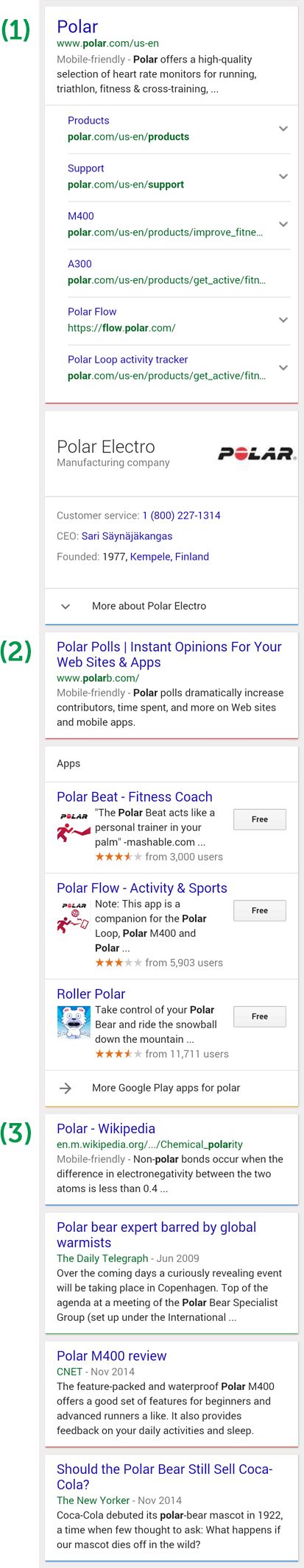You wanna get really crazy? Let's look at an entire SERP for "polar" on an Android device (Moto G). This result also includes In-depth Articles (warning: scrolling ahead):
