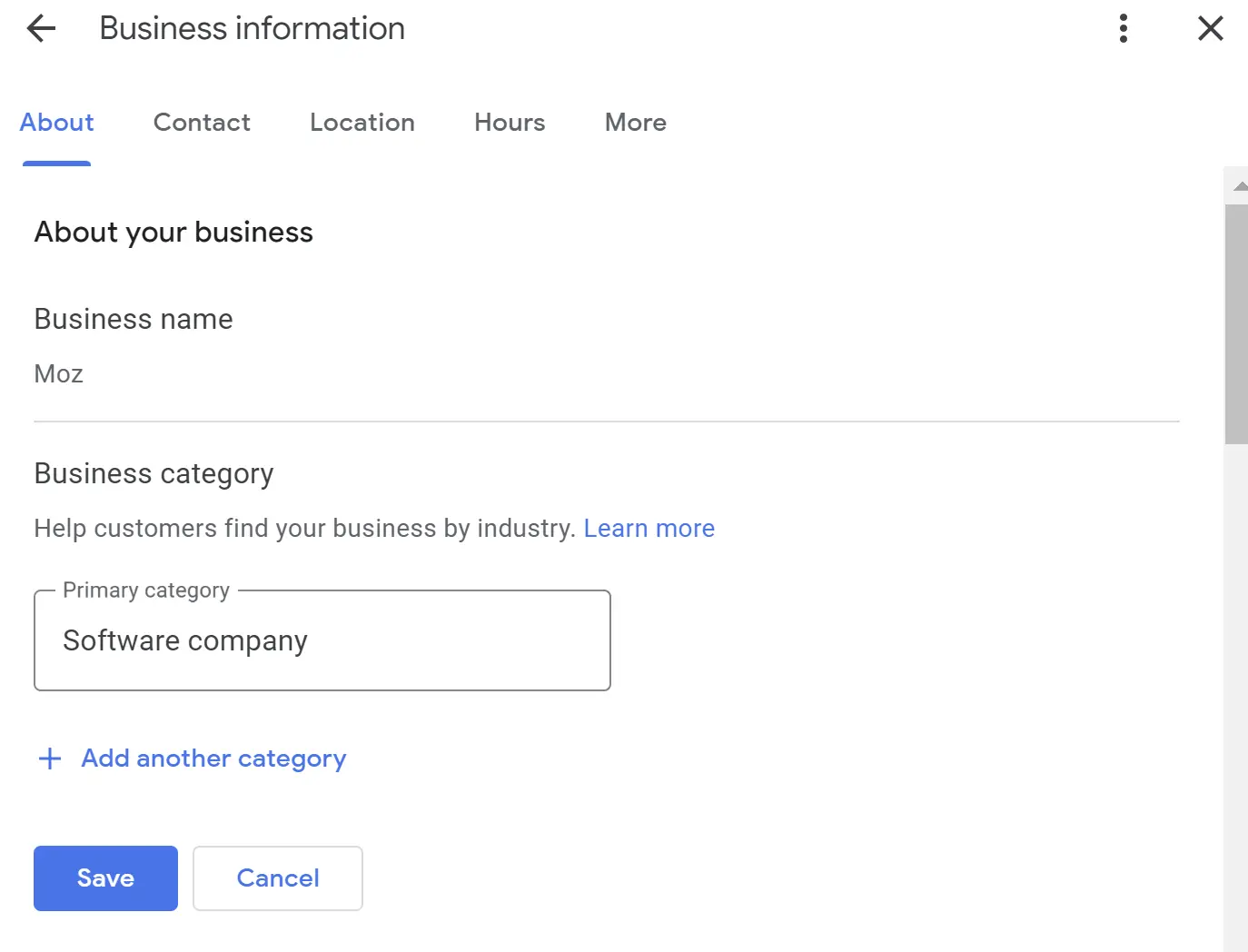 The field is meant to contain only your real-world business name as it appears on your street signage with no extraneous keywords. In this screenshot, you can see that the name is just listed as “Moz”. Not “Moz Vancouver” or “Moz Seattle” or “Moz best SEO software company in America”.