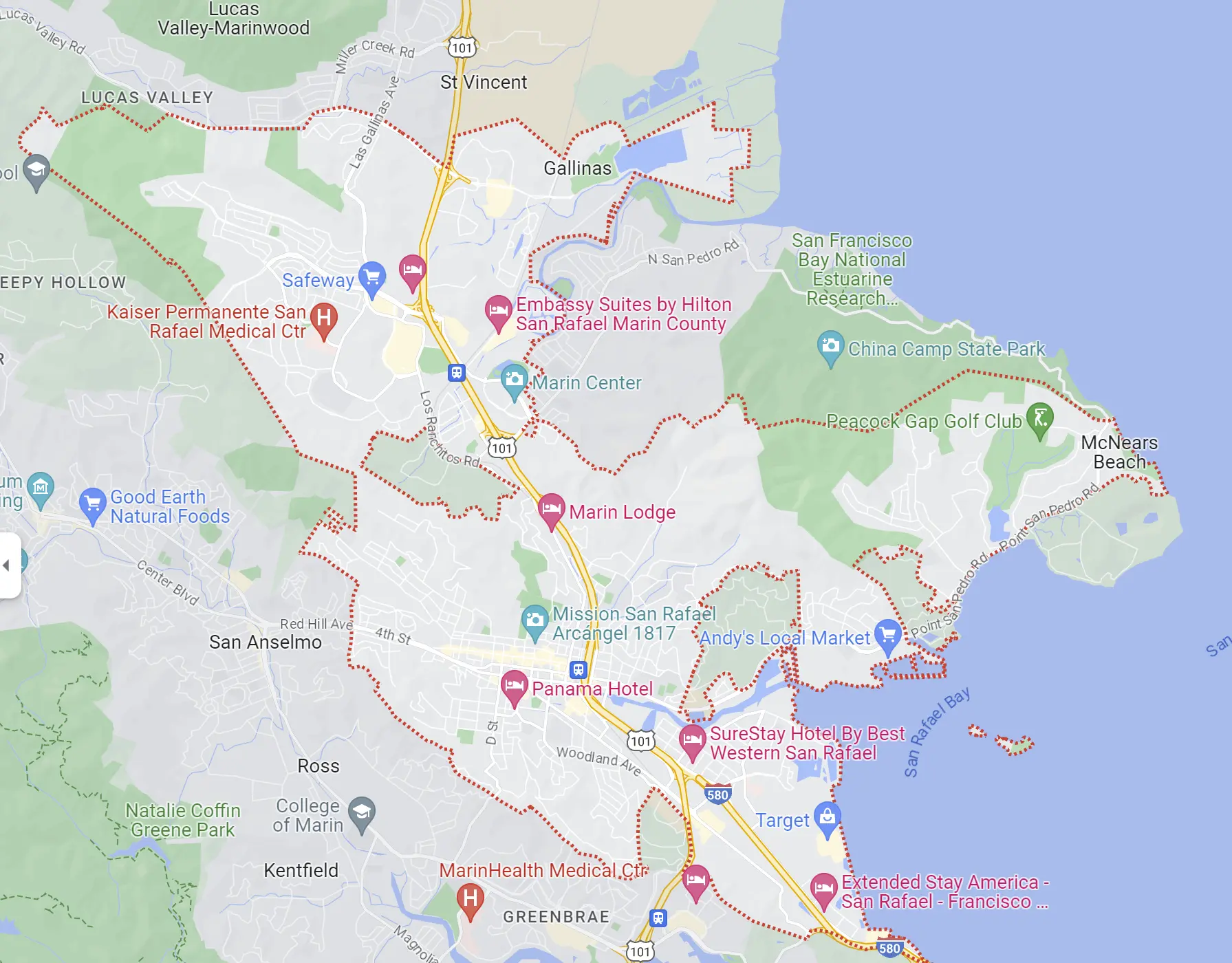 Look up your city in Google and click on the map. The red border, as shown above, indicates Google’s concept of the perimeters of your town or city. The reason this matters to local SEO is that businesses located beyond the border often have a much harder time becoming visible for searchers located within the border or for search phrases that contain the name of the town or city.