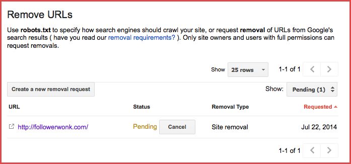 After submitting the request, Followerwonk URLs started disappearing from Google search results in 2-3 hours.