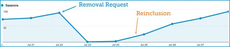 In the chart below, we revoked the URL removal request on Friday the 25th. The next two days were Saturday and Sunday, both lower traffic days.