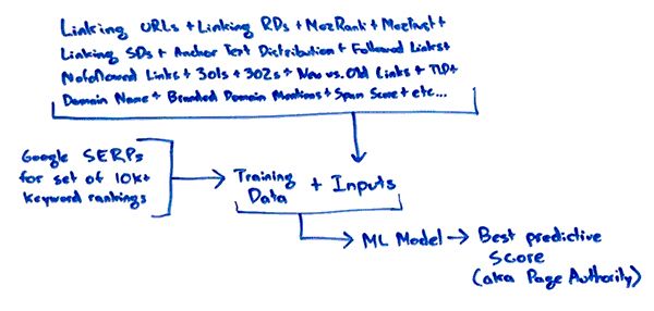 So this is everything we possibly know about a page from its link profile and the domain that page is on, and then we insert that in as the input alongside the training data. We have a machine learning model that essentially learns against Google search results and builds the best possible model it can. That model, by the way, throws away some of this stuff, because it's not useful, and it adds in a bunch of this stuff, like vectors or various attributes of each one. So it might say, "Oh, anchor text distribution, that's actually not useful, but Domain Authority ordered by the root domains with more than 500 links to them." I'm making stuff up, right? But you could have those sorts of filters on this data and thus come up with very complex models, which is what machine learning is designed to do.
