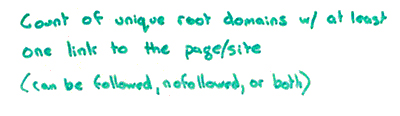 What I haven't told you is whether they're followed or no-followed. Usually, this is a combination of those two unless it's specified. So even a no-followed link could go into the linking root domains, which is why you should always double-check. If you're using Ahrefs or Majestic or Moz and you hover on the whatever, the little question mark icon next to any given metric, it will tell you what it includes and what it doesn't include.