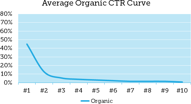 The answer isn't to give up – it's to recognize all of this new complexity, study it, and do our jobs better. Earlier this year, for example, we embarked on a study to understand how SERP features impact click-through rates (CTR). It turns out to be a difficult problem, but even the initial insights of the data were useful (and a bit startling). For example, here's the average organic (SERPs with no features) curve from that study...