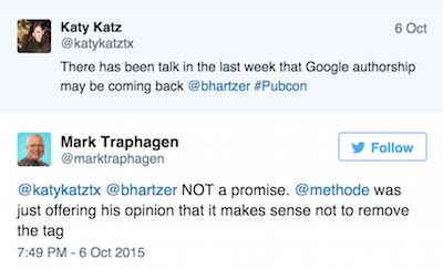 The phrase that made everyone sit up and say, "Did he just say that?" was this: "...because it is possible Google might make use of [rel=author] again in the future."