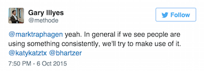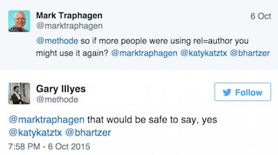 In a subsequent Twitter exchange I had with Gary Illyes, he explained that if enough users are implementing something, Google might consider using it. I asked him if that meant specifically if more people started using rel=author again, that Google might make use of it again. Illyes replied, "That would be safe to say."