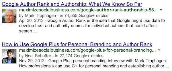We already see this at work with Google+ posts in personalized (logged in) search. When I search for something that AJ Kohn has posted on Google+ while I'm logged in to my Google account, Google will elevate that result to my first page of results and even give it a good old-fashioned Authorship rich snippet! Google has high confidence that's a result I might want to see because AJ is in my circles, and my interactions with him and his content show that he is probably very relevant and useful to me. Good guess, Google, you're right!