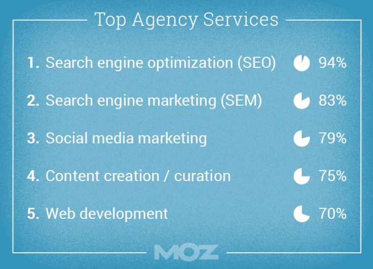 Agency search marketers reported larger teams and more diverse responsibilities. More than one-third (36%) of agency marketers in our survey reported working with more than 20 clients in the previous year. Agencies covered a wide range of services, with the top 5 being: