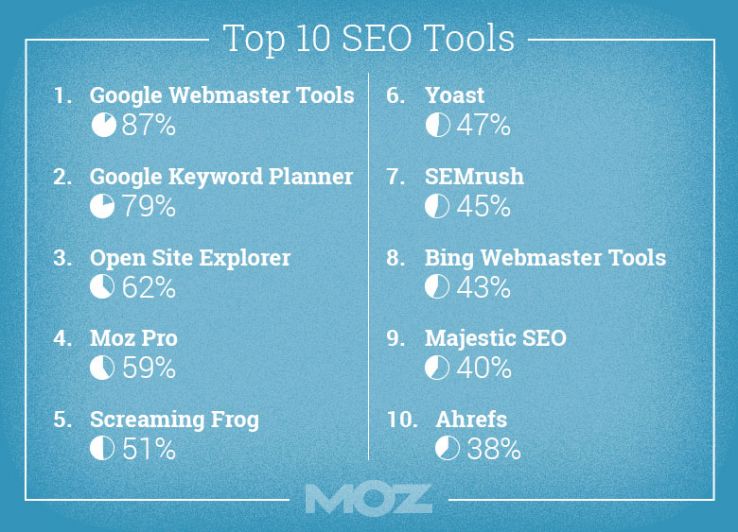 Just like last time, Google Webmaster Tools (now "Search Console") leads the way. Moz Pro and Majestic slipped a little bit, and Firebug fell out of the Top 10. The core players remained fairly stable.