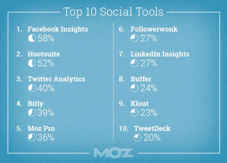 Facebook Insights and Hootsuite retained the top spots from last year, but newcomer Twitter Analytics rocketed into the #3 position. LinkedIn Insights emerged as a strong contender, too. Overall usage of all social tools increased. Tweetdeck held the #6 spot in 2014, with 19% usage, but dropped to #10 this year, even bumping up slightly to 20%.