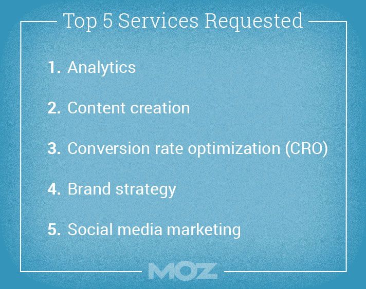 For in-house marketers, "Site Audits" dropped to the #6 position and "Brand Strategy" jumped up to the #3 spot. Naturally, in-house marketers have more resources to focus on strategy.