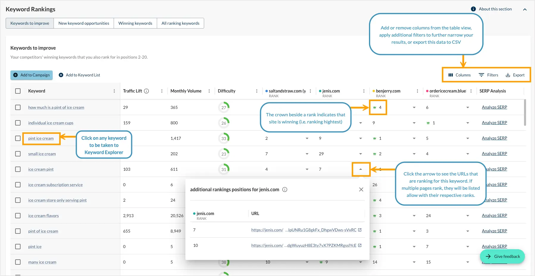 New pre-filtered keyword rankings lists – The new Keyword Opportunities view makes it easier than ever to see where your competitors are ranking and you’re not, helping you spot key gaps in your strategy. The Winning Keywords view shows you all the keywords where you’re already outranking your competitors. Keep an eye on these keywords to make sure you don’t lose ground!